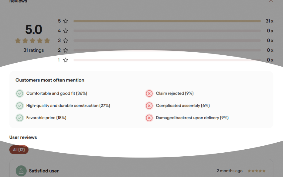 Nincs kedved átlapozni több tucat értékelést? Van egy megoldásunk. Automatikusan feldolgozzuk az összes elérhető értékelést, és kigyűjtjük a lényeget, amit a vásárlók leggyakrabban dicsérnek, és amit kritizálnak. Ráadásul az interneten található külső értékeléseket is beleszámoljuk, nem csak a Biano-n találhatóakat.
